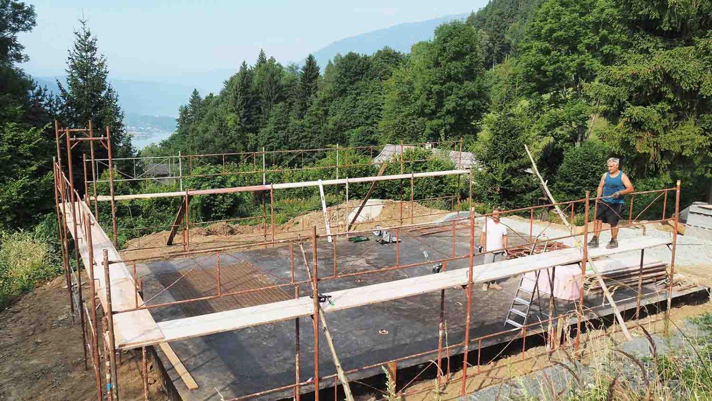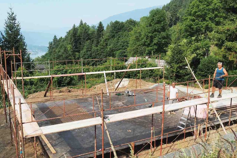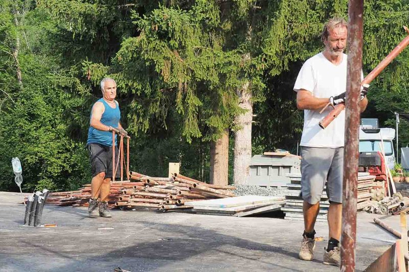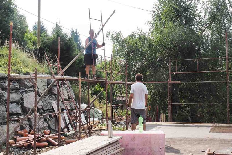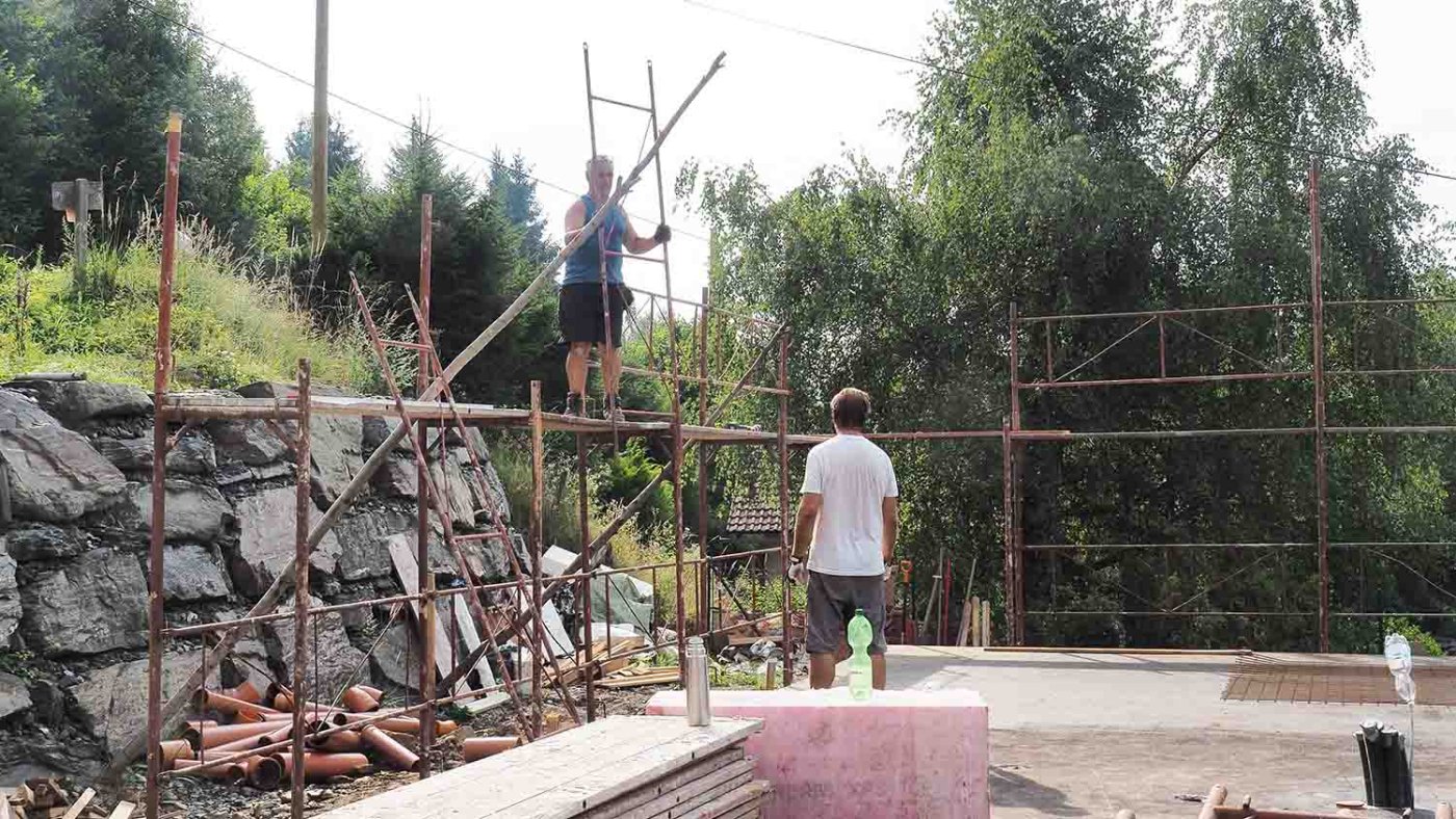 Drei Tage bevor das Haus angeliefert wird, bauen Charly und ich das Gerüst auf, das ich mir von einem Freund ausleihen konnte. Innerhalb eines Tages ist auch dieser Job erledigt, wobei wir die Frontgiebelseite und ein Stück der Nordwestseite offen lassen, damit man sich besser ins Haus und heraus bewegen kann.