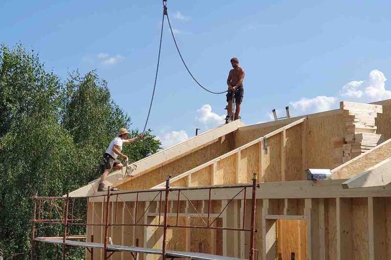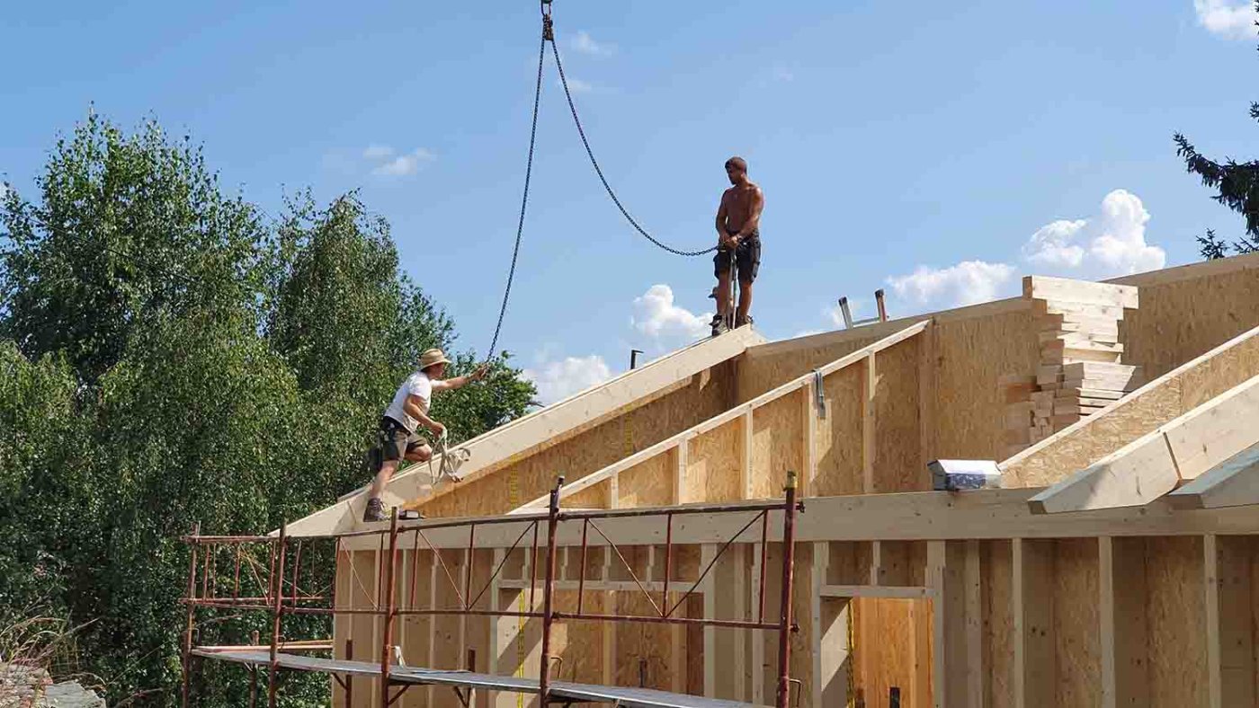 15:41 Uhr: Die ersten Dachsparren werden montiert.