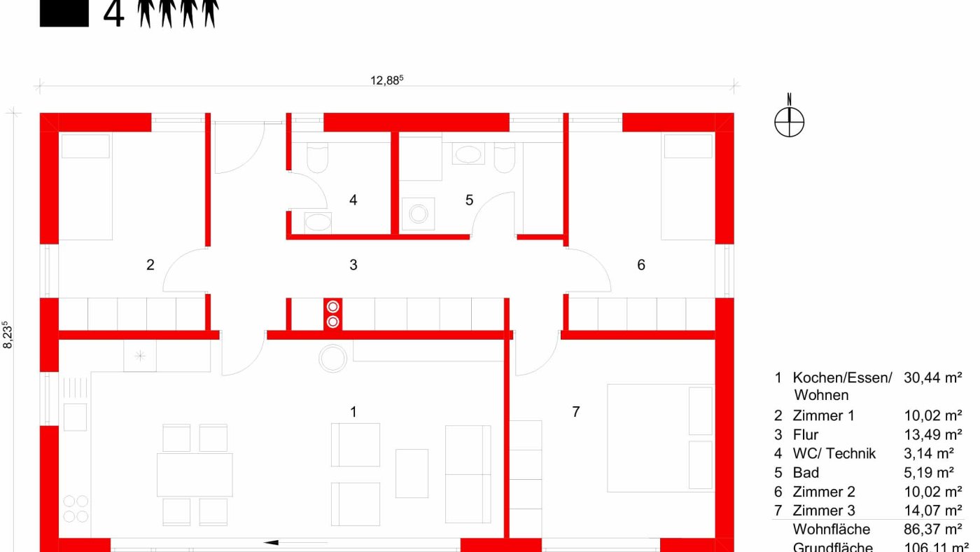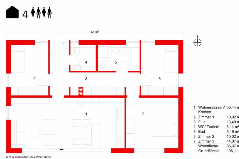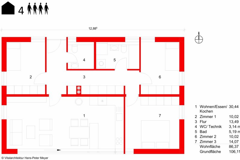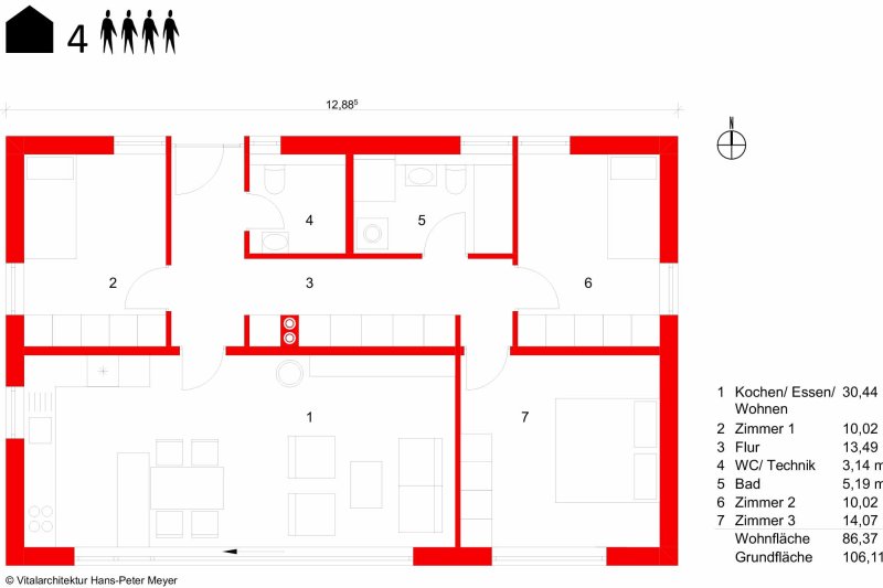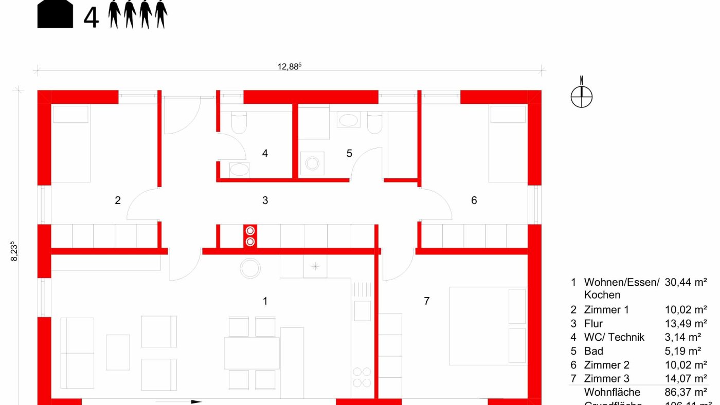 House 44 verfügt über drei Räume, die von einer Familie mit zwei Kindern als Schlafzimmer genutzt werden können. Natürlich bieten sich, wie oben beschrieben, auch andere Funktionen an. Aufgrund der Tatsache, dass es auch in diesen Plänen zwei Bäder gibt, bietet dieser Plan in der Variante E auch die Option einer mehr oder weniger abgeschlossenen Einheit für eine Pflegekraft oder ein erwachsenes Kind.