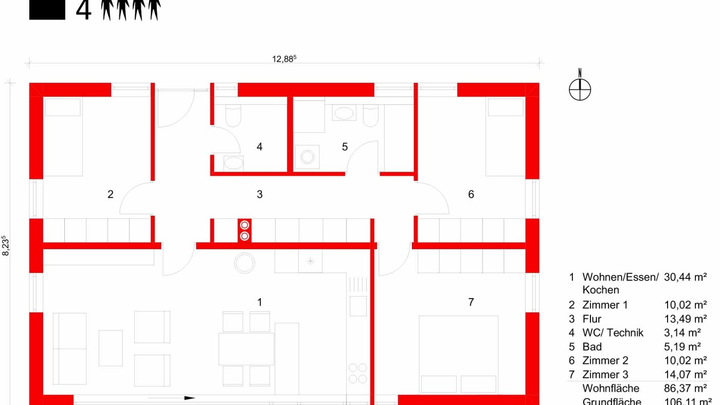 Wie die vorhergehenden Varianten, jedoch statt der Technik ein Dusch- bad im Gäste-WC. Die Technik müsste in diesem Fall auf dem Dachbo- den oder im Wandschrank in der Diele installiert werden.