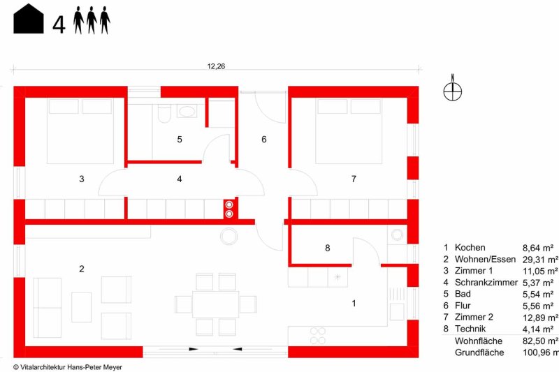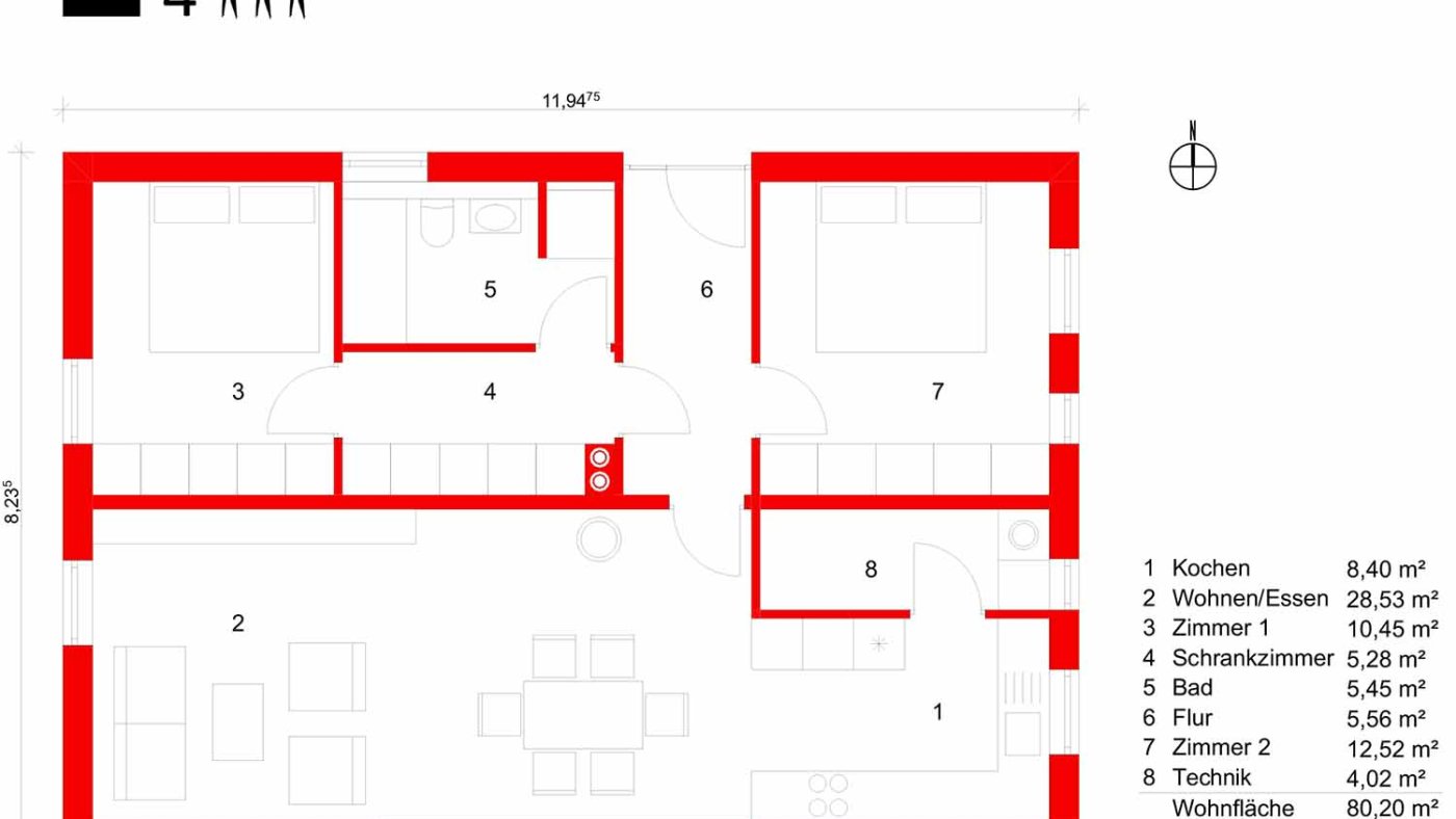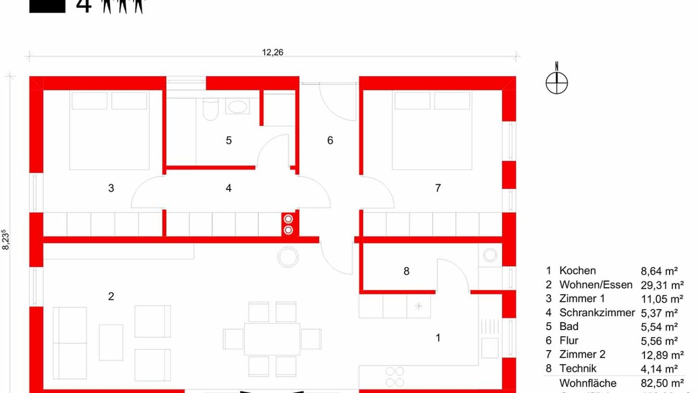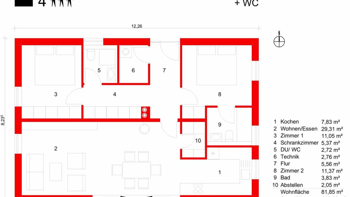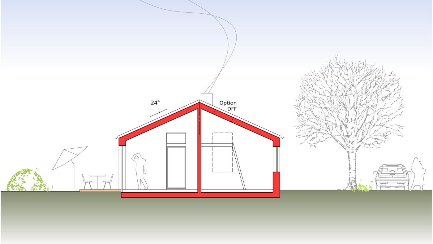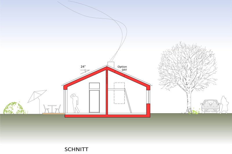 House 43 ist für bis zu drei Personen geplant, also beispielsweise für eine Familie mit Kind oder für ein Paar, das ein Gästezimmer oder einen Arbeitsraum wünscht. In der Variante A + Gäste-WC funktioniert dieser Plan beispielsweise für ein älteres Ehepaar und bietet einen zusätzlichen, abgesonderten Bereich für eine Pflegekraft, der ein eigenes Duschbad zur Verfügung steht – insbesondere in Verbindung mit einer Galerie im offenen Dachbereich, wo das Bett untergebracht werden kann.