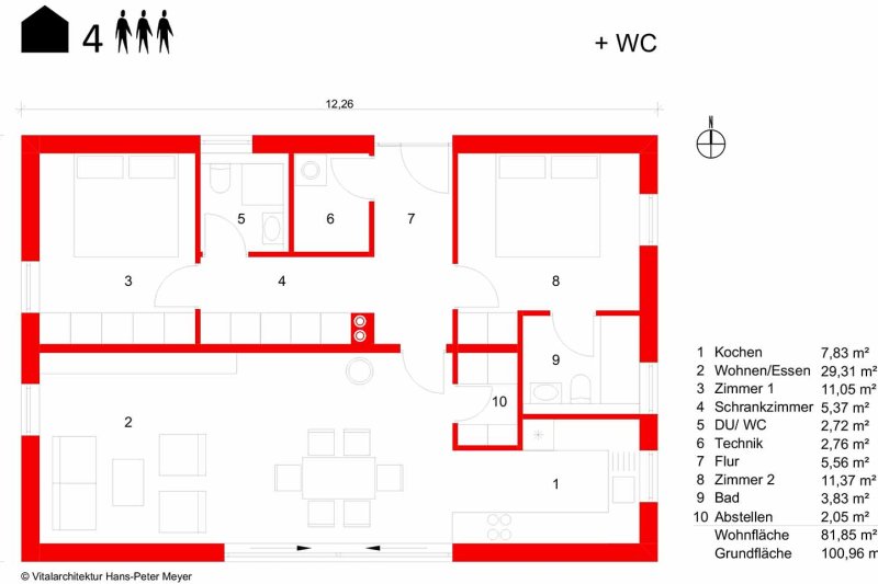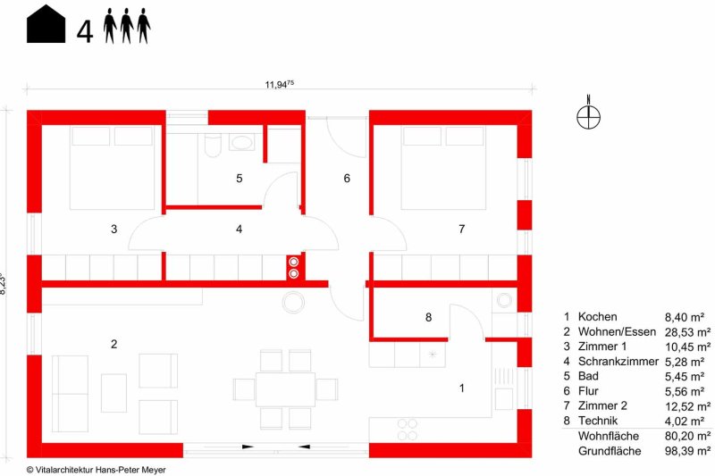• Nordost: Elternschlafzimmer mit 2 m breitem Bett möglich