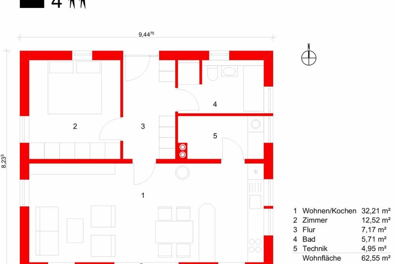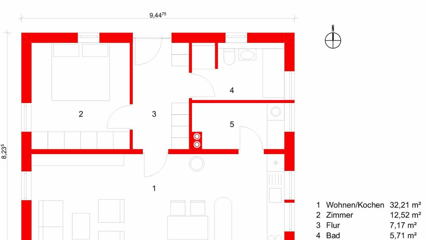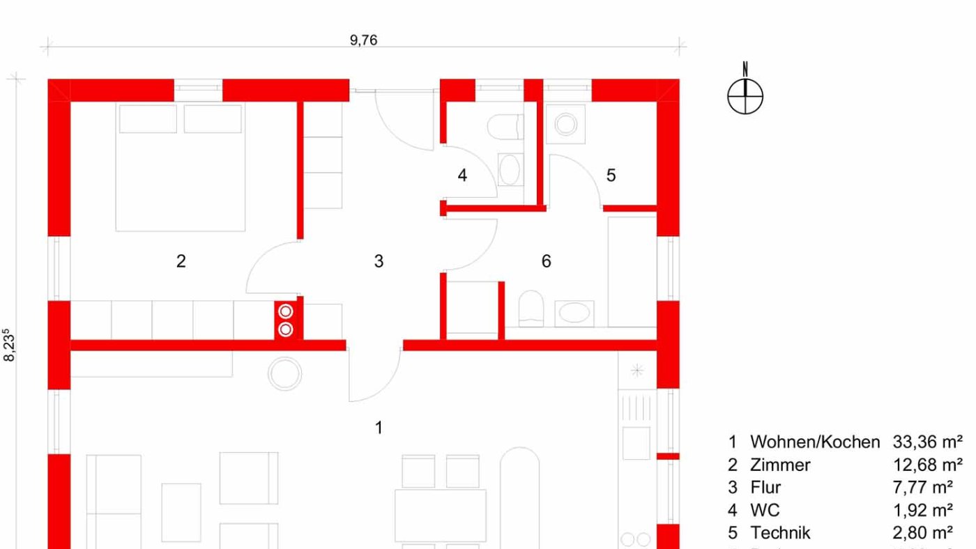• Nordwest: Schlafzimmer im Nordwesten, in dem ein 2 × 2 m breites Bett möglich ist