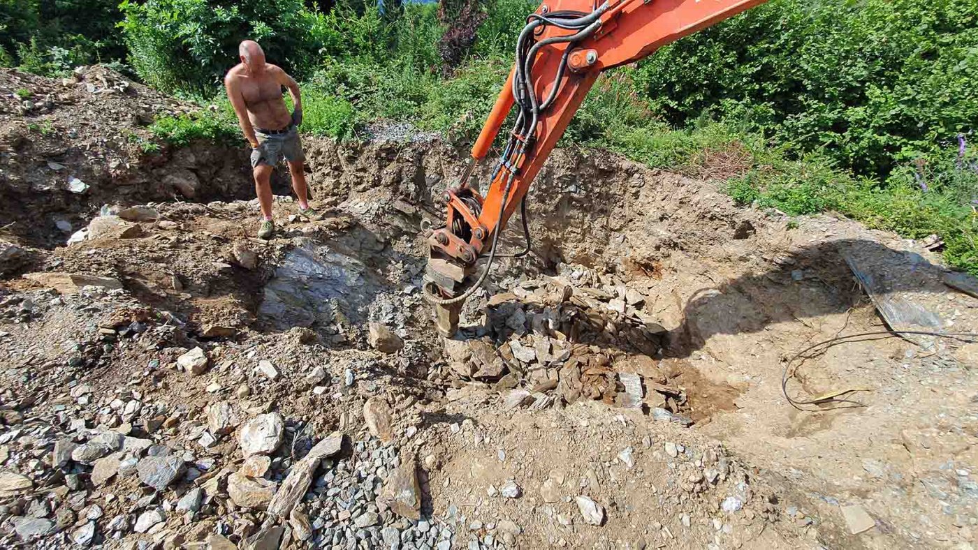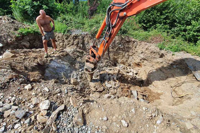 Erste Ernüchterung macht sich breit, als wir beginnen, auf der Südwestseite des Hauses das Plateau aufzugraben, um dort die Zisterne zu verbauen. Nach einem Meter Erdreich stoßen wir auf massiven Fels. Dem rücken wir mit dem Bagger-Presslufthammer zu Leibe, müssen aber bald erkennen, dass das zu aufwendig wird. Immerhin gut zu wissen, dass das aufgeschüttete Plateau – und somit unser Haus – sprichwörtlich auf Fels gebaut ist. Einige Meter weiter finden wir Gott sei Dank lockeres Erdreich, wo die Zisterne relativ leicht eingegraben werden kann.