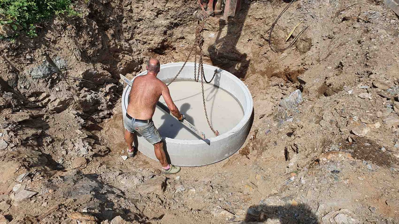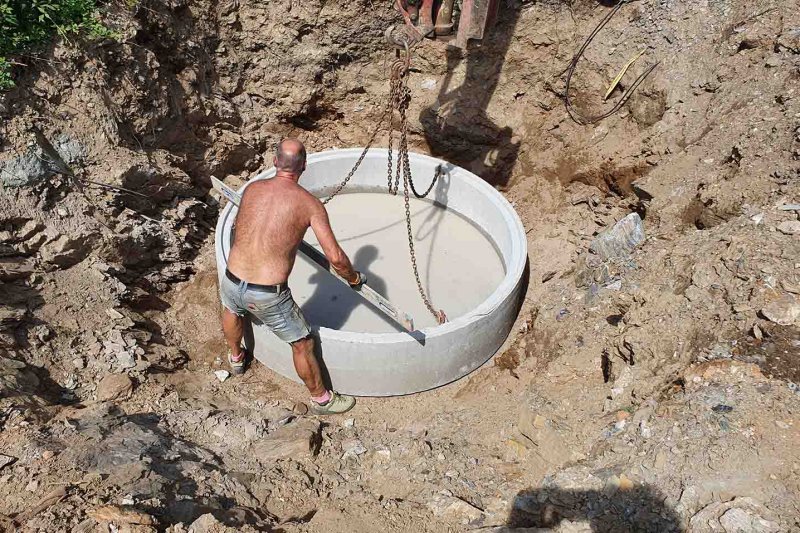 Nachdem das Loch gegraben und eingeebnet ist, misst Andi die geschlossene Bodenplatte der Zisterne mit der Wasserwaage ein. Dann können die weiteren Ringe folgen. Die Ringe messen 2 Meter im Innendurchmesser und sind 75 cm hoch.