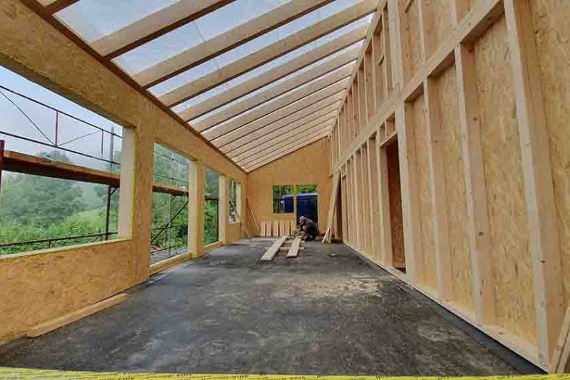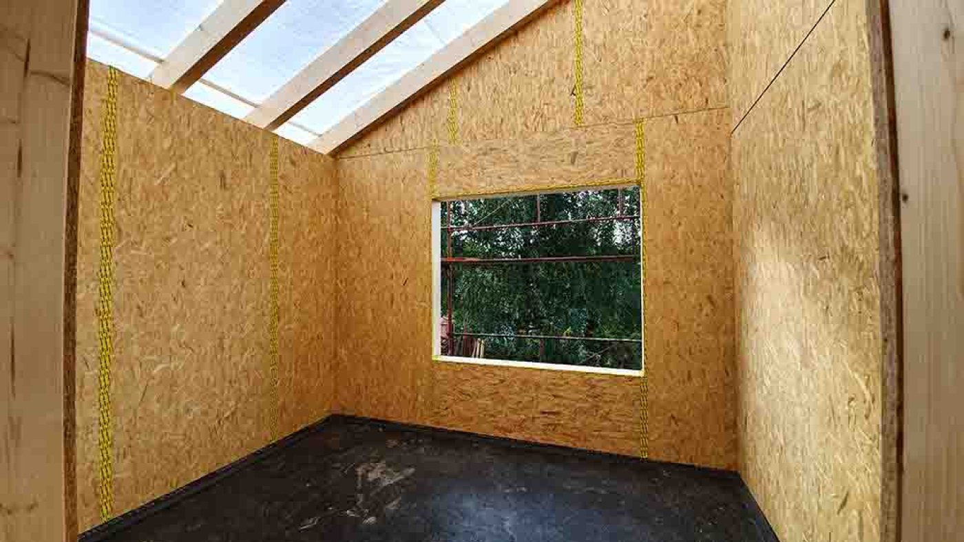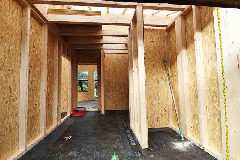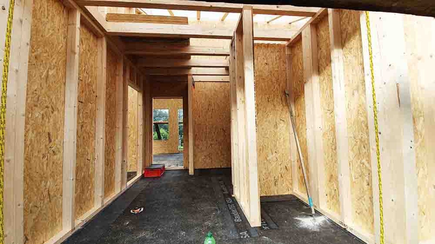 Der romantische Rundgang durch unser neues Domizil nimmt ein jähes Ende, als die Schlude-Jungs mit dem Druckluftnagler die heimelige Stille zerreißen. Sie haben noch ein dichtes Programm, gilt es doch, das Haus mit der Bodenplatte zu verankern, zwischen den Dachsparren Hölzer einzuschrauben und alle Verbindungsfugen zwischen den Wandelementen mit Klebeband abzudichten.