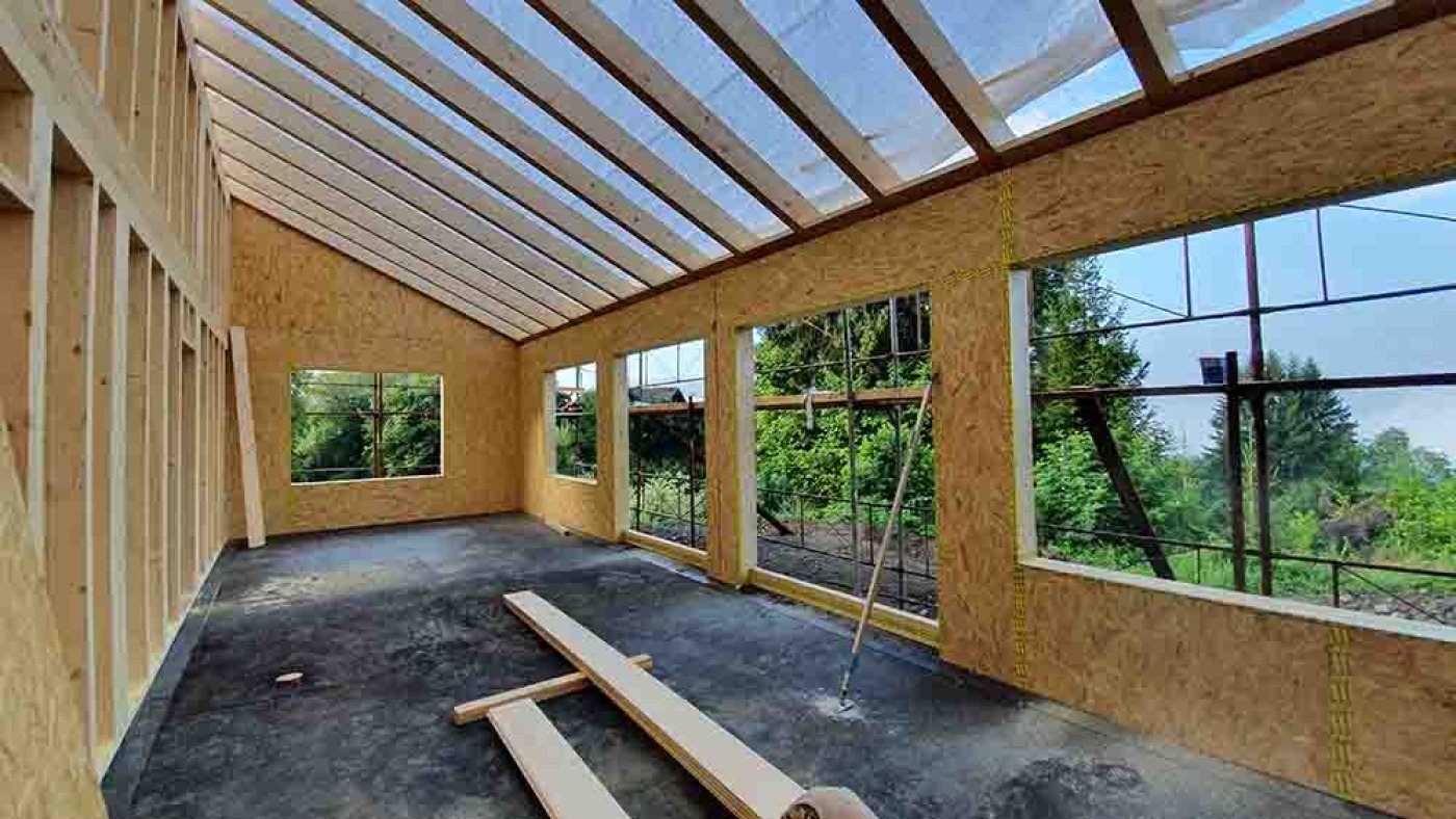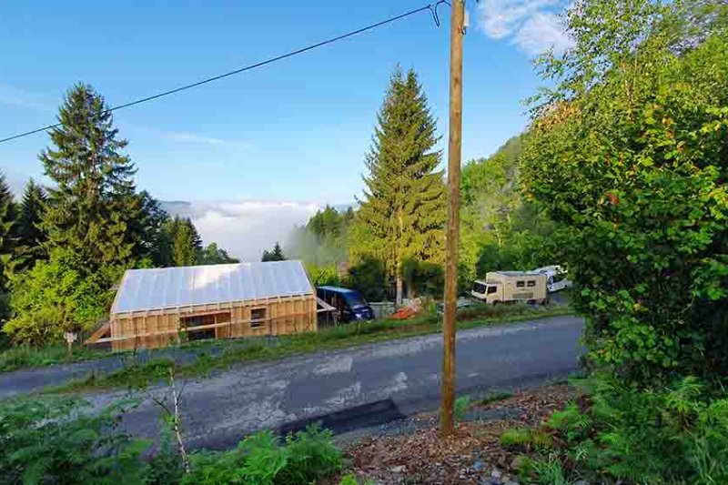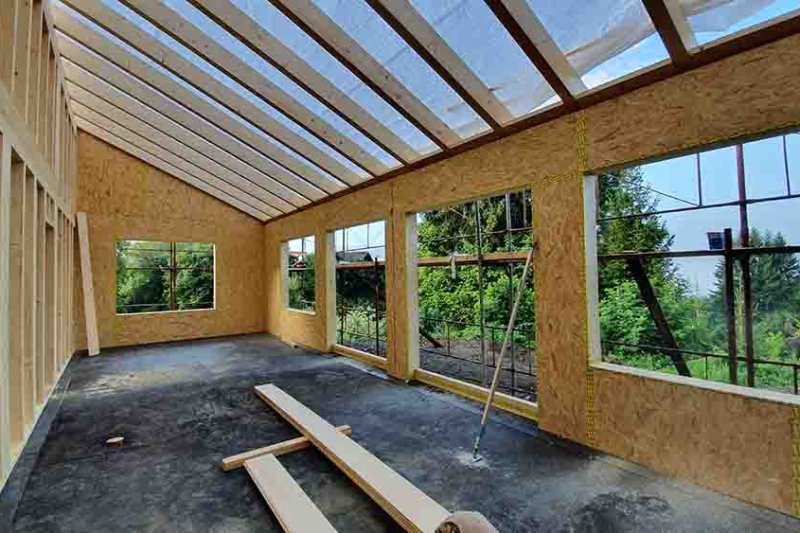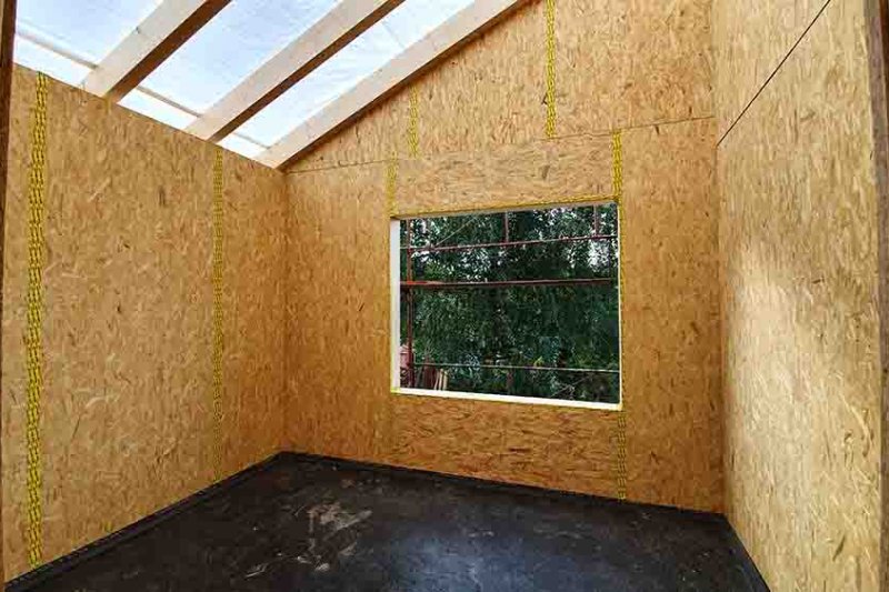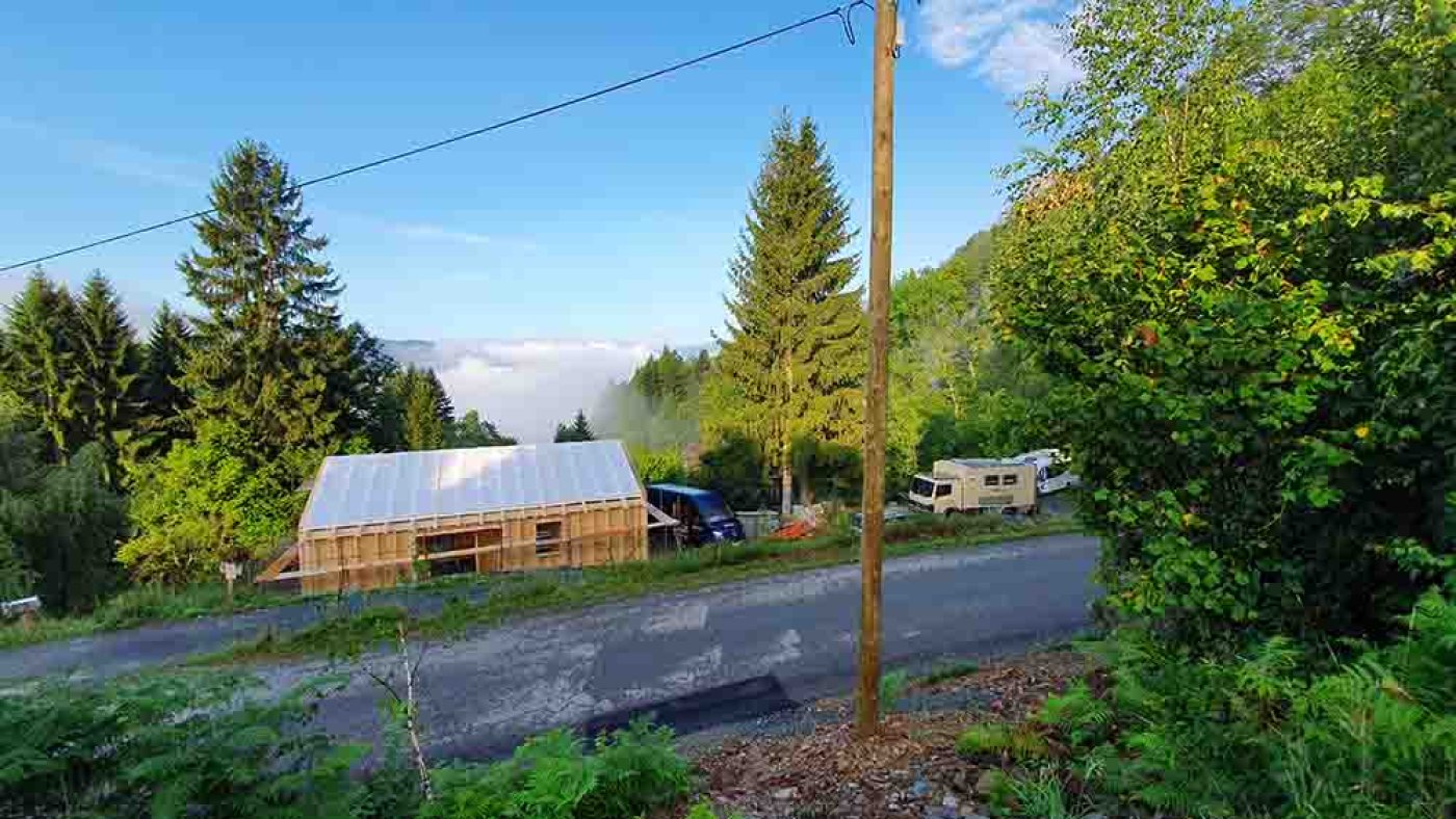 Der romantische Rundgang durch unser neues Domizil nimmt ein jähes Ende, als die Schlude-Jungs mit dem Druckluftnagler die heimelige Stille zerreißen. Sie haben noch ein dichtes Programm, gilt es doch, das Haus mit der Bodenplatte zu verankern, zwischen den Dachsparren Hölzer einzuschrauben und alle Verbindungsfugen zwischen den Wandelementen mit Klebeband abzudichten.