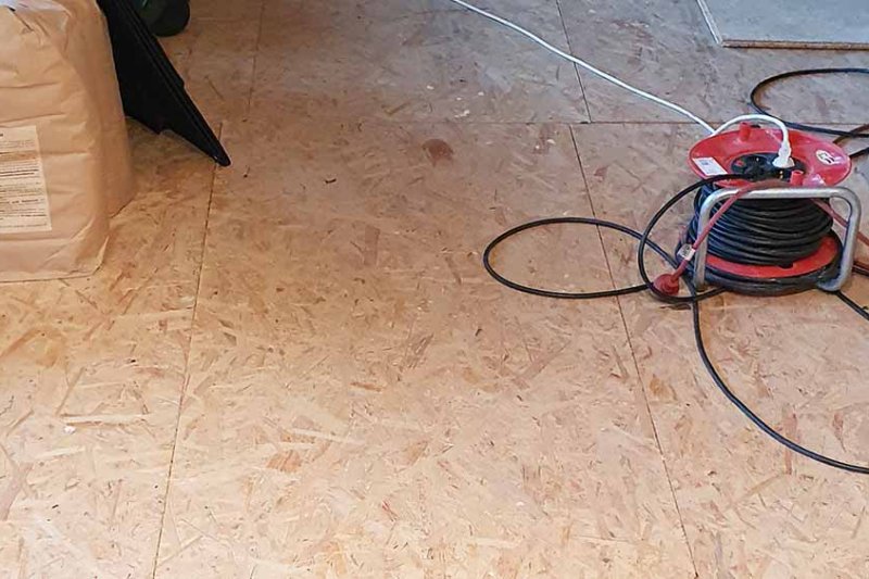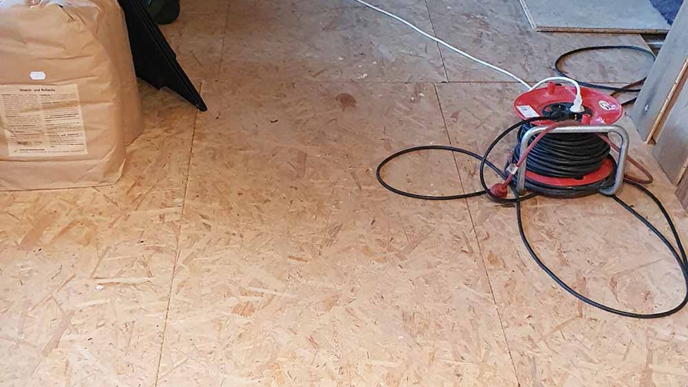 Im Zuge des Deckenausbaus kommt uns allerdings zu Ohren, dass OSB-Platten durchaus nicht unbedingt das Gelbe vom Ei sind, wenn man auf gesundes Raumklima Wert legt. Außerdem haben wir während der Bauphase OSB-Platten auf dem Boden verlegt, um die Lithotherm-Steine und die Heizungsrohre zu schützen. So cool sie auch aussehen mögen – wir haben uns mittlerweile daran sattgesehen. Deshalb lassen wir die OSB-Option wieder fallen, wohl wissend, dass wir für einen Echtholzboden wesentlich tiefer in die Tasche werden greifen müssen. Das nehmen wir aber billigend in Kauf, wenn wir dafür ein gesünderes Raumklima, eine ansprechendere Optik und eine bessere Atmosphäre erzielen. Zwar passt der Dielenboden nicht ganz in unser Günstig-bauen-Konzept, aber schließlich sind die Mehrkosten leicht ausweisbar und jeder Bauherr kann selbst entscheiden, ob er die Einsparungspotenziale des Bodenbelags nutzen will oder nicht.